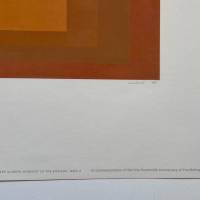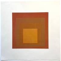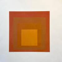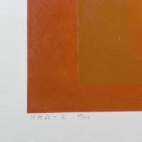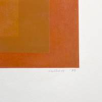 Eine strahlende Version eines der Siebdrucke des deutschstämmigen amerikanischen Künstlers aus seiner emblematischen Op-Art-Serie „Hommage to the Square”, die er 1950 begann. Hier hinterfragt das Quadrat in Orangetönen die Grenzen der Wahrnehmung.