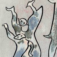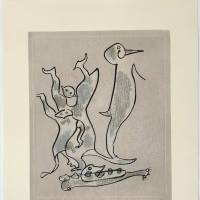 Zwischen Hunden und Wölfen, untersucht die Mehrdeutigkeit der Grenzen zwischen Realität und Imagination, veranschaulicht durch den Verweis auf die Redewendung, dass es zu bestimmten Tageszeiten schwierig ist, den Hund vom Wolf zu unterscheiden. Die fantastischen Figuren auf der linken Seite heben ihre Arme in einer Geste des Schreckens, während Loplop, der emblematische Vogel von Max Ernst, sich von der Szene abwendet, was die dramatische Spannung noch verstärkt. Eine längliche, dunkle Gestalt liegt auf dem Boden und verstärkt das Gefühl der Verwirrung.