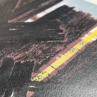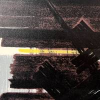 L 2 zeugt von Hans Hartungs Suche nach der Energie des Strichs. Die schwarzen Linien, die sich zu einem dichten, horizontalen Netz verbinden, stehen im Dialog mit blauen und gelben Akzenten. Der für die 1950er Jahre typische azurblaue Hintergrund verstärkt die Kraft der Geste.