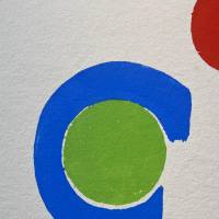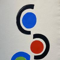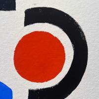 Diese für Sonia Delaunays reife Schaffensphase emblematische Schablone offenbart eine auf kreisförmigen Formen basierende Komposition. Rote und grüne Farbtöne harmonieren miteinander, während blaue Akzente der Komposition einen kraftvollen Rhythmus verleihen und ihr eine lebendige Intensität einhauchen. Gemäß ihrer Interpretation des Gesetzes des simultanen Farbkontrasts und ihrem Beitrag zur Beziehung zwischen Komplementarität und Dissonanz lässt Delaunay die Silhouetten von Kreisen erscheinen und fügt schwarze Kurven hinzu.