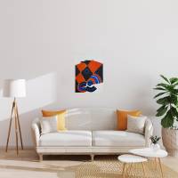 Die Farbwerte bilden eine Harmonie, die auf einem Kontrast zwischen Schwarz und Rot beruht, der durch Blau verstärkt wird. Die leeren Räume sind wie Zwischenräume, die das Licht durchlassen.