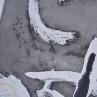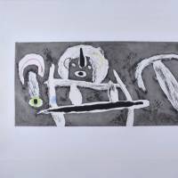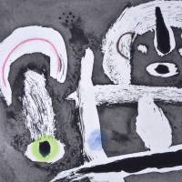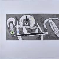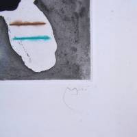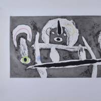 Ein schönes Landschaftsformat über das Studium des Windes, das Miró zu dieser Zeit in einer ganzen Serie begann. Seine Suche nach den verschiedenen Texturen zeigt hier die sichtbaren Spuren der Pinselstriche auf einem mausgrauen Hintergrund. Aus den vom Künstler gezeichneten Zeichen tauchen Figuren auf, wie eine Schöpfung ex nihilo.