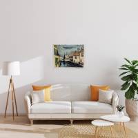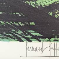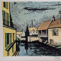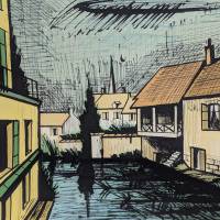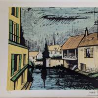 In this view of Arpajon, Bernard Buffet continues his intimate dialogue with the Île-de-France region. Far from the spectacular grandeur of Paris's iconic monuments, here he chooses a town on a human scale, revealed in all its quiet solemnity. The composition, rigorous and uncluttered, invites subtle reflection on the persistence of places and the slow erosion of time.