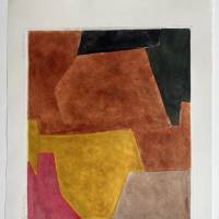 This intaglio print by the Russian-born artist and master of post-war abstraction is reminiscent of the brown-toned compositions he produced around 1940. Here, broad flat tones of brown intermingle simultaneously with luminous yellow and mauve, energizing the whole. It is delimited by darker segments of black and green, which likewise contain the expanse of internal movement characteristic of Poliakoff's compositions. The work was engraved in a small edition in collaboration with Jean Signovert in his Paris studio.