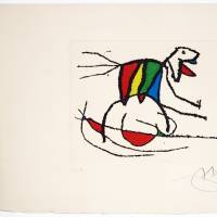 El Sobreviviente visita los Pájaros reveals Miró’s art at its most delicate: a pared-down universe where emptiness converses with line, and every gesture seems to rise from a breath. Within this minimalist composition, the small dog—barely drawn—slips in with touching discretion. A fragile yet instantly recognizable silhouette, it appears as an earthly presence in this dreamlike space, a figure that survives, observes, and accompanies. Through its very simplicity, it gains a particular intensity, becoming a subtle echo of Neruda’s narrative.