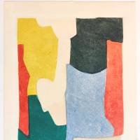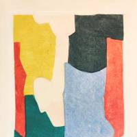 One of the twenty copies of this etching, aquatint and burin on zinc originally attached to the book Parmenides, dialogue of Plato with the text in French by Pierre Albert Birot. This beautiful work of modest size was realized with Jean Signovert and published by La Rose des Vents, Paris. The marriage of the five colors with a dominance of pastel tones gives rise to a happy reflection on the forms.