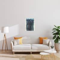 A fine print by the German-born artist, a major figure in modern abstraction. The composition is based on a dense network of black lines, punctuated by electric blue strokes. It is arranged vertically on a cerulean blue background, which he used particularly during this period.