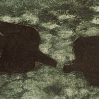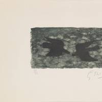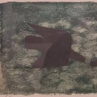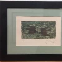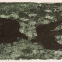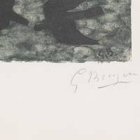 A stencil of the artist resuming the frontispiece of the collection of poems by André Verdet, published the same year. Here, a mesh in shades of forest green and green of gray, suggests that a lush nature sets the scene of this iconic flight of birds.