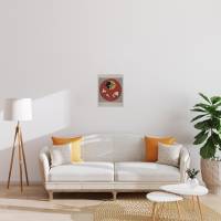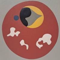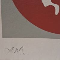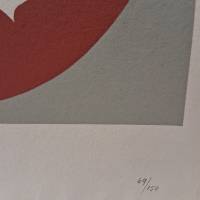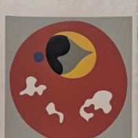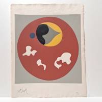 Our work is a plate from Hans Arp's last work combining etchings and poems. His sense of spatial composition is skilfully applied, with organic shapes delineated in bold flat tints dominated by a wine-red hue.