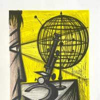 Our artwork is an early lithographic print of a poster produced for the exhibition “Les peintres témoins de leur temps” at the Musée Galliera, held from January 18 to February 17, 1969. Buffet was an eminently figurative artist at a time when abstraction reigned supreme. This representation of the technological advances of his time reflects his involvement in and influence on modern art.