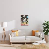 Greke is a young artist who has just joined our gallery. For art and through art, he created a world he shares with us. Chimeras born from his imagination populate some of his works like the current one. This creature has a mineral face, as if sculpted in the rock. There is nothing frightening about this chimera, which seems to look at our world with its large, round, astonished eyes, in addition to this unique eye, as a Cyclops. All around, a universe of delicacy, of colors, of lightness.