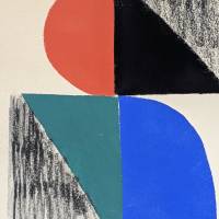 Esta sublime plantilla está ritmada por la ingeniosa combinación de triángulos y semicírculos de colores, muy apreciados por el artista. La complementariedad del rojo y el verde y el contraste que aportan los dos tonos de azul crean un verdadero dinamismo y una dualidad cromática en la obra.
