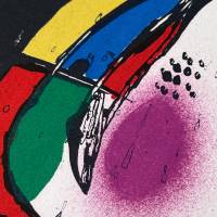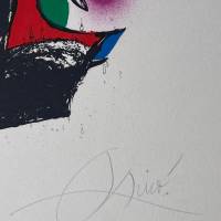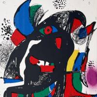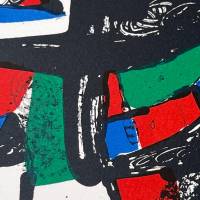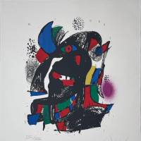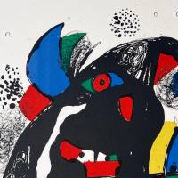 Realizada en 1981, esta litografía pertenece al último período creativo de Miró. De un entramado de líneas y colores, el artista hace surgir la forma de una cabeza de perfil. El negro, profundo o con textura, dialoga con destellos de rojo, azul y amarillo en un lenguaje plástico característico de la madurez del pintor.