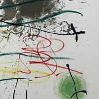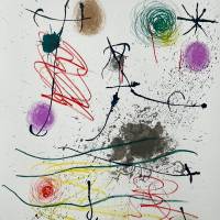 Nuestra litografía sirvió de frontispicio a la colección homónima de facsímiles, realizados con el procedimiento Jacomet a partir de acuarelas de Joan Miró y dirigidos a su entorno. El artista catalán crea una composición etérea utilizando su vocabulario expresivo basado en la armonía de colores y signos, y la espontaneidad del gesto.