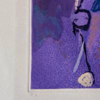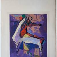 Marino Marini rinde homenaje al famoso dramaturgo británico en su serie de grabados homónima realizada en 1972 y 1977, cada una compuesta por ocho láminas. La obra presentada muestra a un jinete sobre su montura blanca, en una atmósfera crepuscular, y refleja el interés constante del artista por el estudio pictórico y simbólico del caballo.