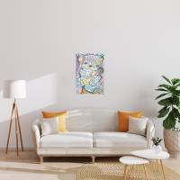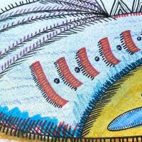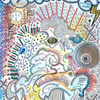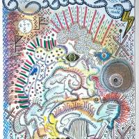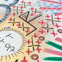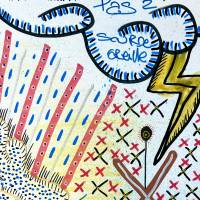 Gréké nous invite à une contemplation de son univers coloré et expressif dans ce dessin aux couleurs vives. Aux abords de l’art brut et naïf, chaque impulsion et vision de Gréké sont transmutées en personnages et en motifs récurrents : multiplications de points, croix, traits et cercles.