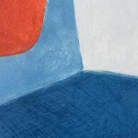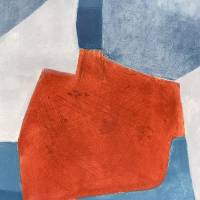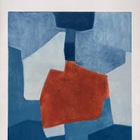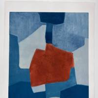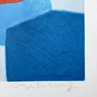 Dans cette gravure, Poliakoff compose un assemblage savant d’aplats bleus, du bleu ciel au bleu roi, dont la matière s’exprime pleinement grâce à la technique utilisée, valorisant les aspérités du support. L’insertion centrale du rouge cuivré, couleur complémentaire au bleu, rythme la composition. L’œuvre fut imprimée par Sérvulo Esmeraldo et éditée par XXe siècle, Paris.