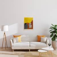Le principe de composition de cette œuvre est le déséquilibre : deux parties clairement distinctes de font face. D’abord la partie supérieure, avec ce jaune bouton d’or presque en aplat, une belle densité de couleur qui donne de la profondeur et presque un aspect velouté, puis la partie inférieure, composée de formes géométriques imbriquées, de couleurs différentes, posées avec un effet frotté qui les rend presque translucides. Comme on le voit dans cette description, les deux parties de l’œuvre s’opposent point par point.