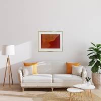 Dans cette œuvre, l’orange s’impose. Décliné en quatre variations majeures, ce beau camaïeu orangé confie au tableau une chaleureuse harmonie. Il parait faussement constitué en aplat mais à y voir de plus près, les couleurs se côtoient sans se juxtaposer. Elles s’accolent et se superposent, comme si chaque couleur faisait partie intégrante des autres. On le voit notamment grâce au traitement des textures apporté par la gouache. Par endroits, le fini est poli, par d’autres, il donne une impression de peinture frottée. On perçoit donc à la fois une unicité chromatique fusionnant avec une disparité des finitions, ce qui crée une certaine transparence de la matière.