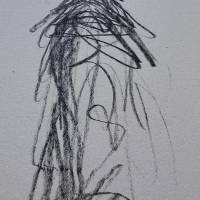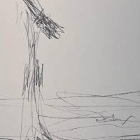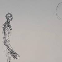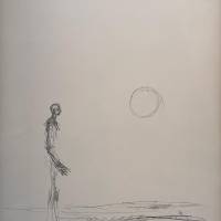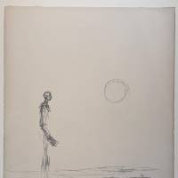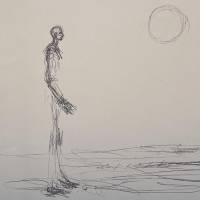 D’un trait dépouillé, presque tremblé, il inscrit dans l’espace la silhouette fragile d’un homme debout, confronté à un soleil isolé, suspendu dans le vide blanc de la page.