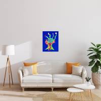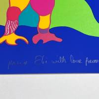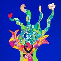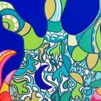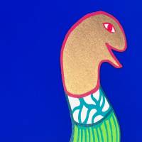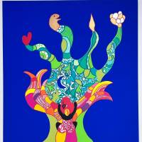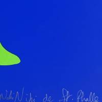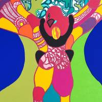 Niki de Saint Phalle invite le spectateur dans un univers coloré et expressif où un oiseau fuchsia et jaune fait face à un arbre aux branches symboliques. Les motifs fantastiques, les couleurs intenses et les touches dorées composent un monde foisonnant et hypnotique, révélant l’imaginaire débordant de l’artiste et sa capacité à transformer confrontation et symboles en émerveillement visuel. L’œuvre y traduit une vitalité flamboyante et la puissance créatrice qui nourrissent son parcours personnel.