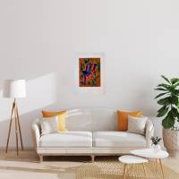 Les Jongleurs permet à MArini d’explorer l’abstraction à travers le rythme, l’équilibre et le mouvement, comme dans ses sculptures. L'artiste italien emploie des couleurs opposées sur le cercle chromatique pour accentuer la tension visuelle de la scène, qu’il renforce encore par des formes sombres et rugueuses dessinant les silhouettes en pleine action.