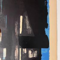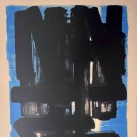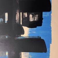 La lithographie, par nature plane, est ici subvertie par l'énergie du geste de Soulages. On y distingue l'intervention physique de l'artiste : les traces de brosse, les raclages, les empreintes qui façonnent la matière. C'est dans ce geste que le noir révèle sa polysémie, passant de l'aplat mat à la brillance intense. Cette densité palpable du noir est d'autant plus magnifiée qu'elle s'oppose à la profondeur lisse et évasive du bleu persan en arrière-plan.