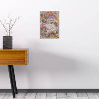 Un dessin à la composition complexe où le jeune artiste part de l’essentiel, le point. Fondement du dessin et de la géométrie, il est familier dans son œuvre, aussi bien que ses dérivés. Soutenue par des bandes colorées dans un jeu de transparence des matières, cette composition captivante laisse entrevoir un personnage, figure allégorique de la manie.