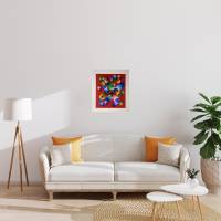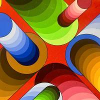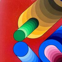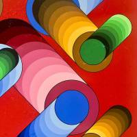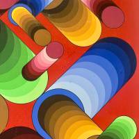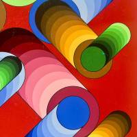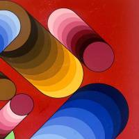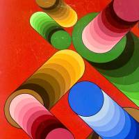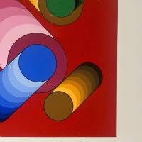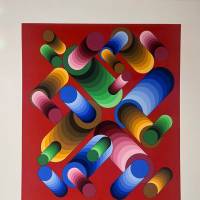 La disposition des cercles et des dégradés de bleu, de vert et de jaune crée une tension saisissante avec l'arrière plan grenat. Ce jeu subtil crée un effet de volume et de vitesse, rappelant la fascination de Vasarely pour l’optique et l’interaction entre couleur et espace.