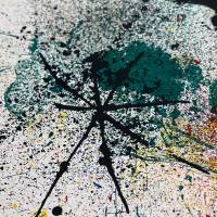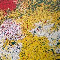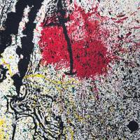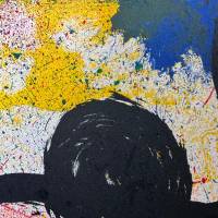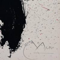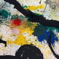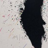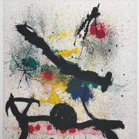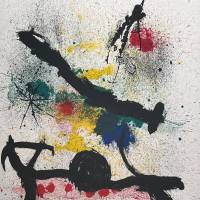 Joan Miró livre ici une œuvre d’une énergie vibrante, où l’abstraction joue avec la spontanéité du geste. Les éclats de bleu, de vert, de rouge, et de jaune contrastent avec le noir profond des tracés sinueux et presque calligraphiques. Les jets d'encre apportent une dimension tactile et dynamique. Ils créent une sensation de vitesse et une profondeur inattendue, jouant avec la perception et l’illusion d’une surface granuleuse.