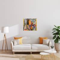 Une lithographie magistrale en douze couleurs et d’un beau format, caractéristique de l’artiste néerlandais. Les dominantes de bleus arrangent une composition géométrique mouvementée, soulignée par des apports de rouge vif et des manques, laissés blanc.